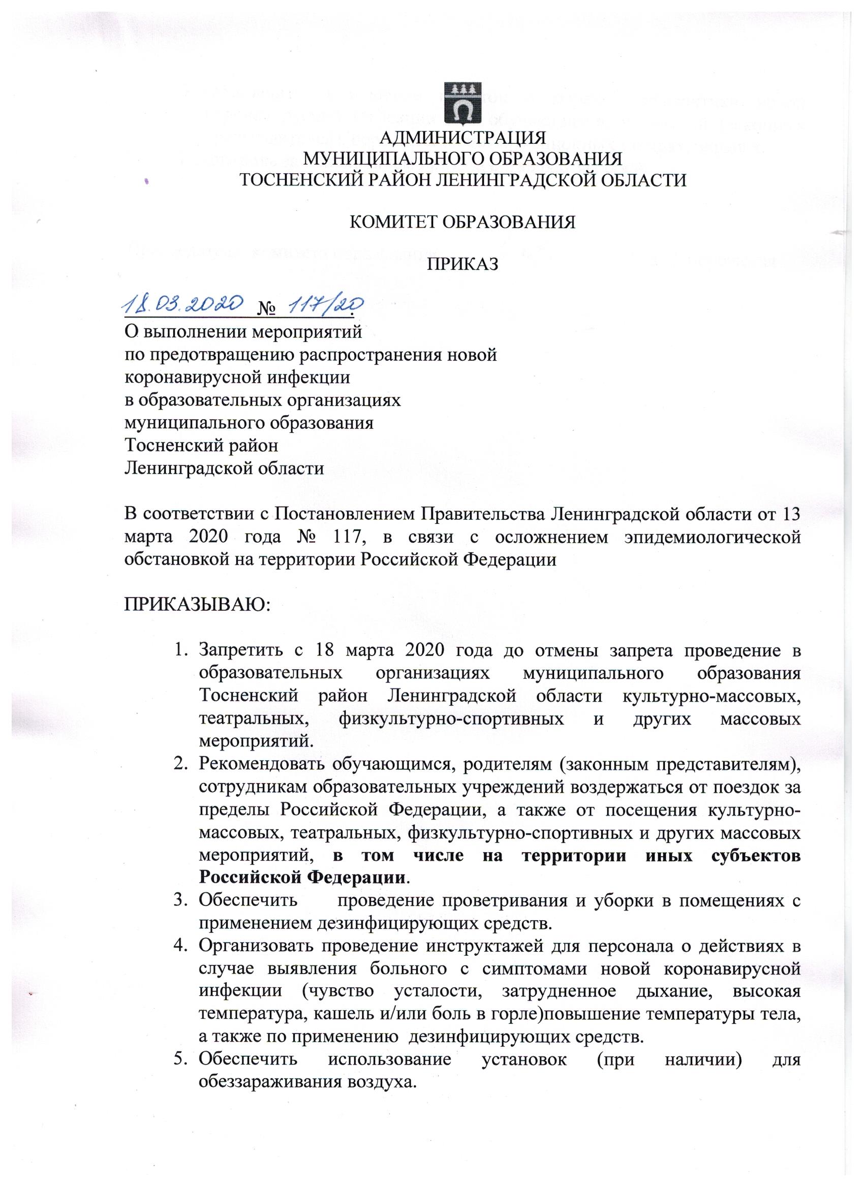 Приказ О выполнении мероприятий по предотвращению распространения новой коронавирусной инфекции в образовательных организациях Тосненского района