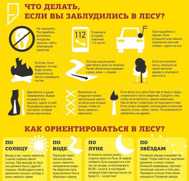 данной ситуации не стоит поддаваться панике и бежать без оглядки. Необходимо успокоиться, оставаться на том же месте и позвать на помощь. Вас не нашли, значит, пришло время звонить родственникам, друзьям, если нет связи, то следует набрать номер службы спасения – 112, она доступна всегда. Сообщите о том, что вас окружает, вам подскажут, как выйти из леса. Правила поведения в лесу для школьников подразумевают знание частей света. В полдень встаньте спиной к солнцу, ваша тень будет указывать на север, восток окажется по правую руку, а запад – по левую. Следуйте указаниям специалиста МЧС.Если у вас нет телефона, то прислушайтесь к звукам вокруг, заслышав людские голоса, звук машин или другие признаки цивилизации, идите в том направлении. Если нет таких звуков, то следует отыскать ручей, он обязательно приведет к реке, если есть река, значит, поблизости будут люди. По пути следования оставляйте зарубки на деревьях или заламывайте веточки, это укажет ваше направление спасателям и поможет вам, если вы будете ходить по кругу. Природа меняется, поэтому не стоит полагаться на расположение мха и муравейников. Попробуйте вспомнить с какой стороны вы вошли в лес, в каком направлении двигались. Оглядитесь, если увидели линии электропередач, то следуйте вдоль них.