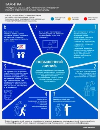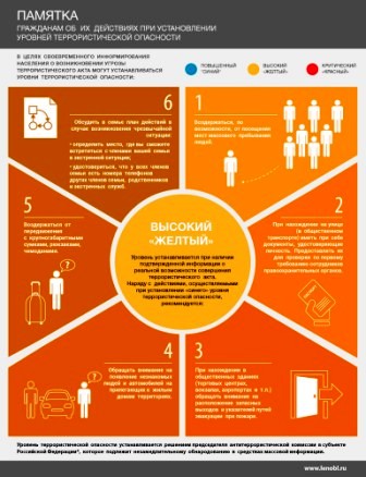 при получении информации об эвакуации действовать согласно указаниям сотрудников органов внутренних дел (администрации объекта) или ответственных за обеспечение правопорядка, соблюдать спокойствие и не создавать паники.